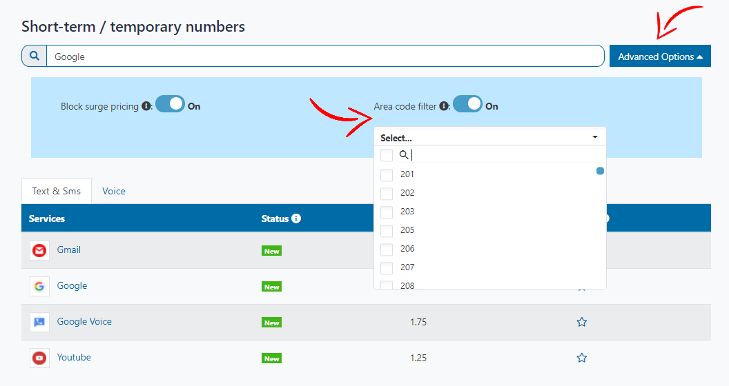 Choose any area code listed in our dropdown. You will receive access to a phone number with that area code. This filter can be found under "Advance Options" on the verification page.