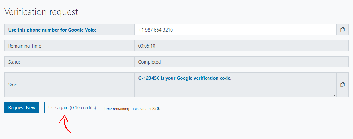 If you’ve just used a number to perform a verification, but need immediate access to the same number within a minute or two, you can click the “Use again” button at the bottom of the verification page. This feature will allow you to reuse the number you just used for another verification.