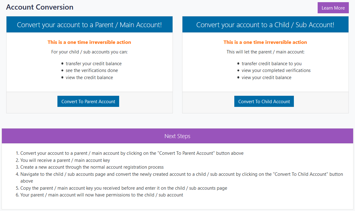 Designate one account as a “Parent” account and distribute credits to multiple “Child” accounts. This is a great option if you are an employer with multiple employees. You can also keep track of each account’s verification history.